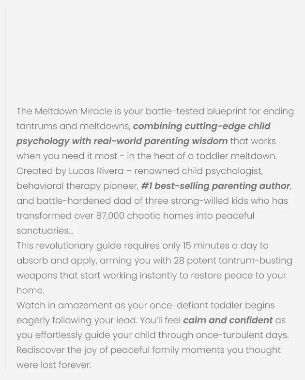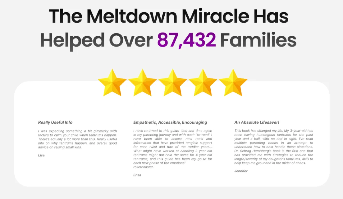 The Meltdown Miracle stands out because it combines cutting-edge child psychology with practical, real-world solutions. Unlike one-size-fits-all approaches, our 28 strategies offer a comprehensive toolkit that can be tailored to your child's specific needs. We address the root causes of tantrums, not just the symptoms. Plus, our step-by-step guide ensures you're never left guessing how to implement these powerful techniques.